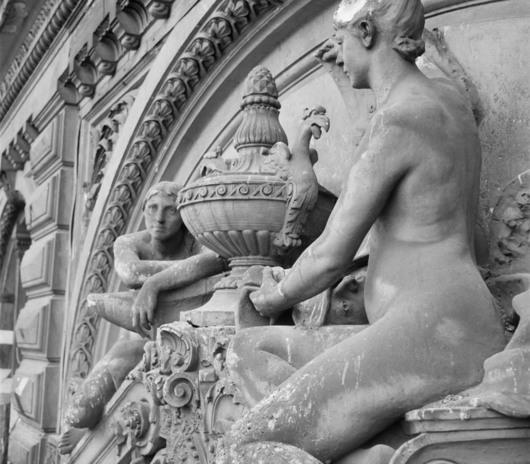 The figure of the eleventh hour of the evening stands as a steadfast memory of the grand stone building of the Nordic Union Bank. The façade repeated strong bird-themed ornaments, such as eagle statues that symmetrically guarded the roof ridge from end to end. A gatekeeper at the threshold of night guides time without the help of the sun. Its posture resembles an hourglass and simultaneously alludes to the Renaissance ideals of proportion, which also bind human and building together.