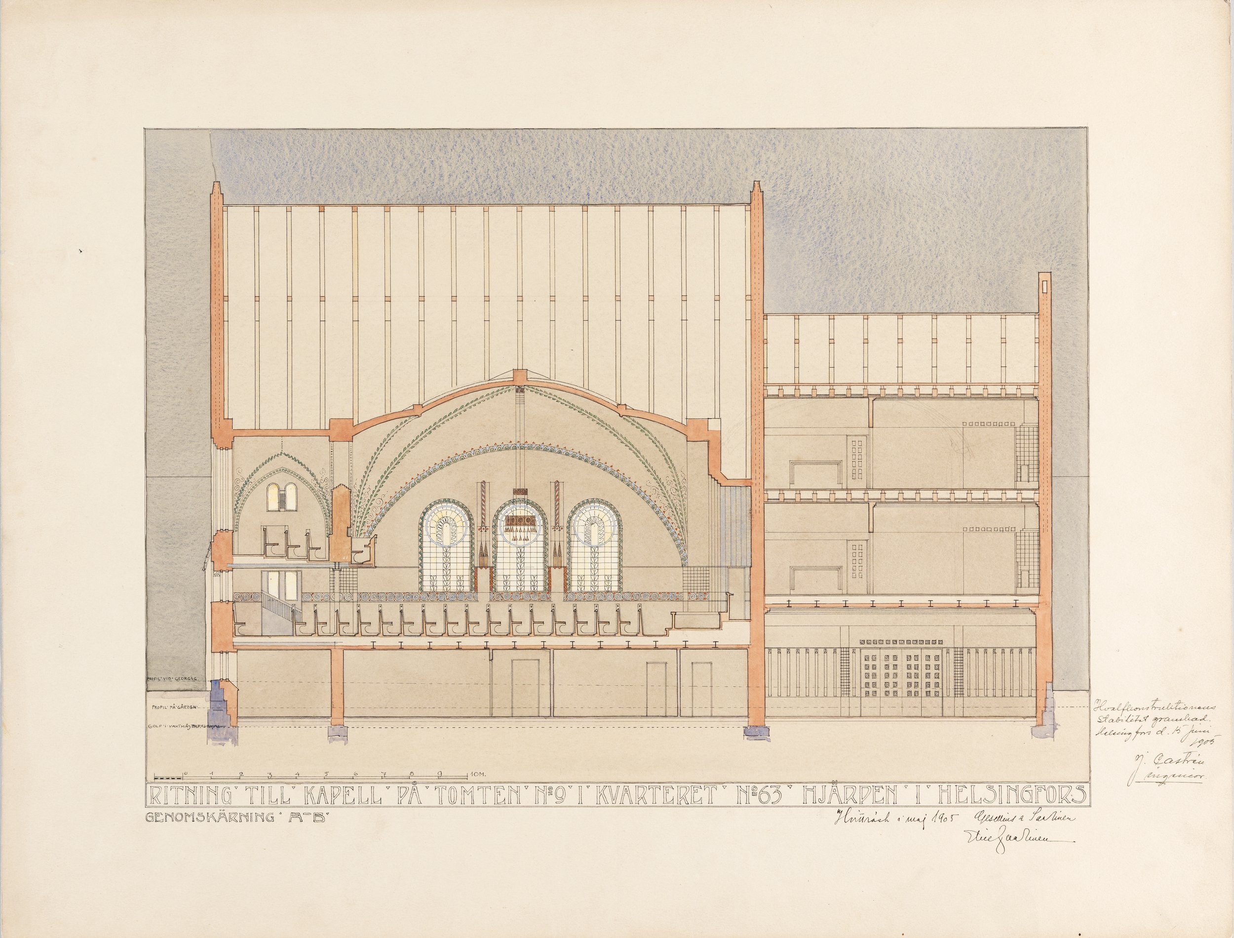 Osoite | Address: Yrjönkatu 19Arkkitehti | Architect: Eliel Saarinen, Gesellius & SaarinenValokuvaaja | Photographer: tuntematon/unknown, Helsingin kaupunginmuseo - Helsinki City MuseumEliel Saarisen Emanuel-kirkon pitkittäisleikkauspiirros 1905